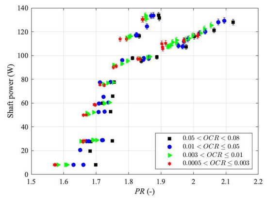 Shaft power of the M-RVE prototype versus the PRs at different OCRs.