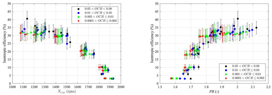 The isentropic efficiency of the M-RVE prototype by the shaft speed with different OCRs (left) and the isentropic efficiency of the M-RVE prototype by PR with different OCRs (right).