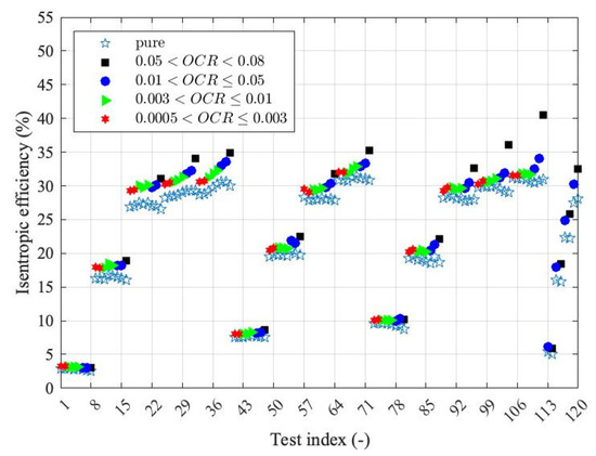 Isentropic efficiency of the M-RVE prototype considering mixture and pure fluid properties with different OCRs.