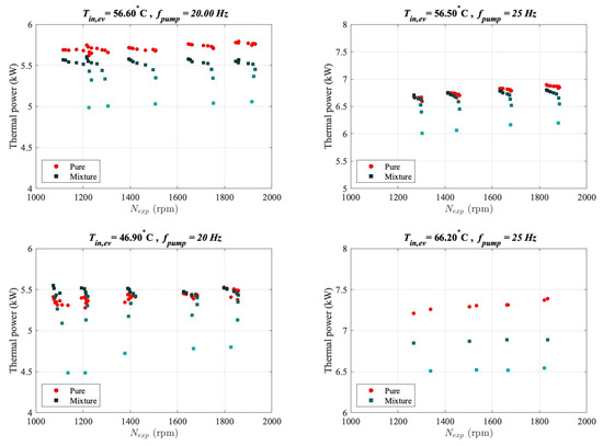 The evaporator thermal power at different shaft speeds, and operating conditions—The brighter colours represent higher OCRs for the mixture.