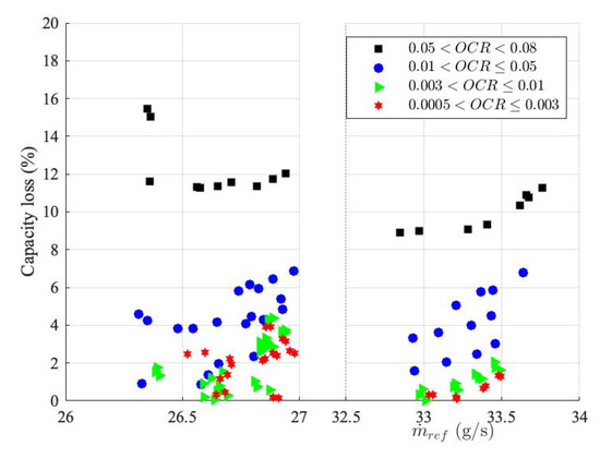 Figure 9 shows the capacity loss at different mass flow rates of the mixture. The impact of the oil on the evaporator capacity loss is significant at higher OCRs. The minimum capacity loss at OCRs higher than 5% is 8.8%, while the maximum capacity loss of almost 6.8% is predictable for OCRs lower than 5%.