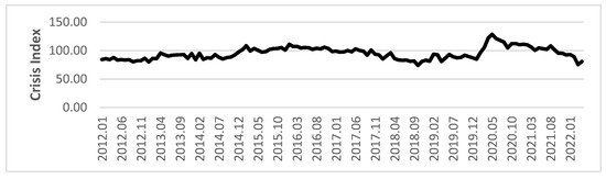 The crisis index was generated based on the weights and data extracted using the above process. The crisis index (C.I.) was created using Formulas (1) and (2) below, where B.I. is the interim Business Index of the industry, is the th normalized indicator value, and is the weight of the th indicator: