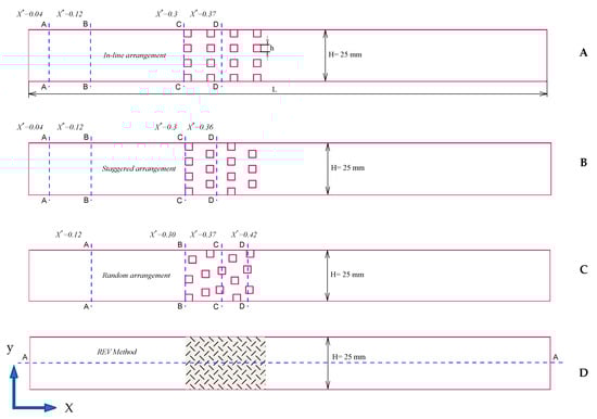 Scheme of different configurations for the pore-structure and the REV methods; In-line (A), Staggered (B), Random (C) and the REV scheme (D).