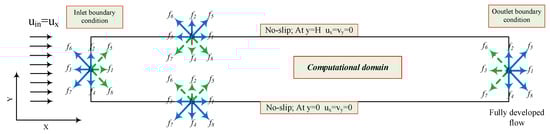 At the domain boundary, specific components of the distribution function (i.e., inlet, outlet, top and bottom nodes and obstacles boundaries) are unknown, as shown in Figure 2. These unknown components are calculated from the known components by setting appropriate constraints depending on the desired boundary condition.
