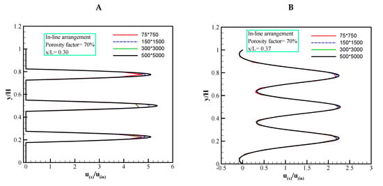 The lattice grid independency of the solution was evaluated for the first case in Figure 1 to select the appropriate lattice grid. Different lattice grids included 75∗750, 150∗1500, 300∗3000 and 500∗5000 in y and x directions, respectively. The comparison of the velocity profiles at x/L = 0.30 and x/L = 0.37 sections for the in-line configuration are shown in Figure 3.