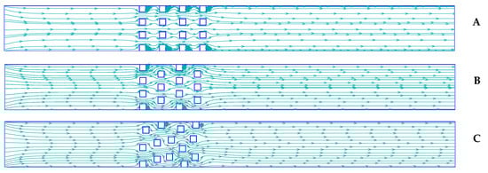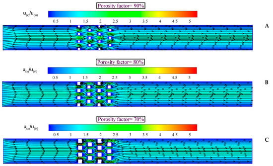 The effect of various obstacle sizes on the velocity field is shown in Figure 6 in terms of streamlines and velocity contours in the case of configuration B (staggered obstacles) for three values of porosity factor (90%, 80%, 70%).