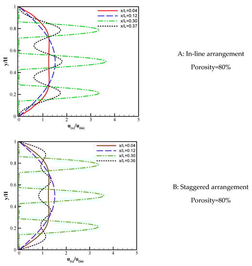 Fluid flow was fully developed at , then it entered to the porous part. It is observed that some low-velocity zones were formed in porous parts due to boundary-layer separation. On the contrary, there was a very high-velocity zone between the obstacles, for A and B cases. The effect of the presence of the porous medium becomes more evident with velocity line graphs at cross-sections of obstacles. The highest value of the dimensionless x-velocity showed in the third cross-section for in-line and staggered arrangement geometries; its value was .