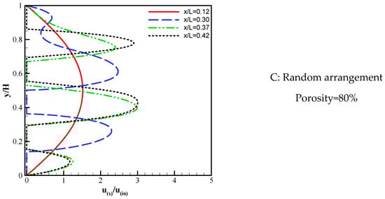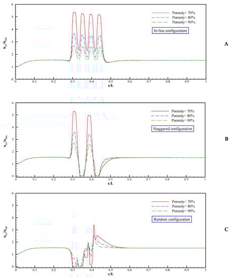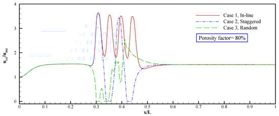 Figure 7 shows the longitudinal velocity along the x-axis of the channel at position y = H/2, for the configurations A, B and C for three values of porosity factor. This position is important because it allows us to compare the velocity profiles of different configurations and porosities, as they have the same initial and boundary conditions. Fluid flow with a uniform velocity profile enters the channel after developing through the hydrodynamic entrance region, then it enters the porous part as a developed fluid flow. When it reaches the first obstacles, it diverts from the straight path and moves toward the blocks with different arrangements, which leads to an increase in velocity. In this case, the high-velocity regions are created between the obstacles. By decreasing the porosity factor to 70%, the velocity increased rapidly. After passing the porous region, the fluid flow reached its fully developed situation. Based on the velocity pattern, it seems that the first case study should have the highest pressure drop and the third geometry the lowest one. This is because the in-line arrangement has a shorter distance between all block columns, while fluid flow in the random configuration can pass through the obstacles more easily. The maximum velocity was enhanced by decreasing the porosity factor in all cases. The arrangement of obstacles is an essential factor in controlling the maximum velocity.