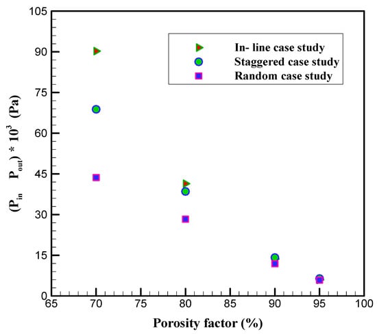 The in-line arrangement generated the highest pressure drop and the random one generated the lowest one because of the geometrical resistance.