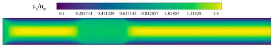 Figure 10 presents a longitudinal velocity contour corresponding to the in-line arrangement with a porosity of 70%.