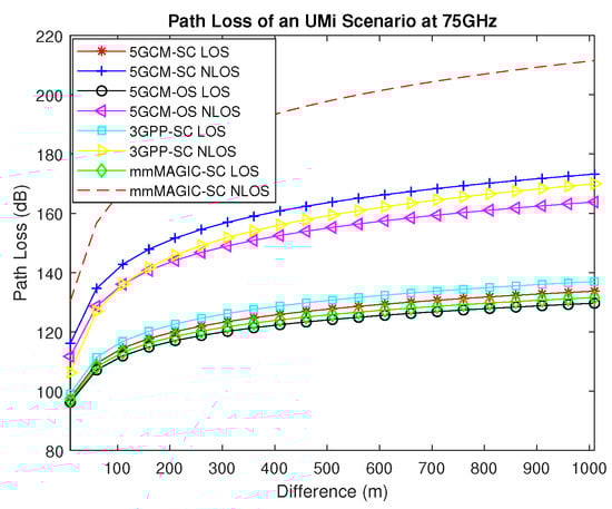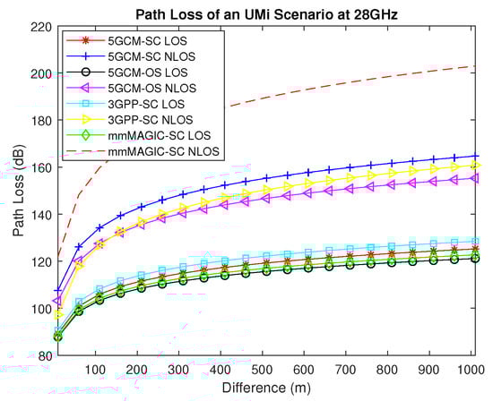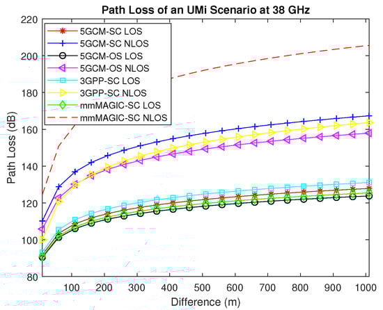 It can be seen from Figure 5, Figure 6, Figure 7 and Figure 8 that each model’s path loss gradually rises with distance and frequency. In comparison to the other models, the 5GCM and 3GPP model generates the lowest path loss in LOS and NLOS scenarios, respectively, and these two models are assumed as optimal path-loss models and the optimal distance is 300 m in urban macro scenarios. The detailed PL values at various frequencies are listed in Table 6.