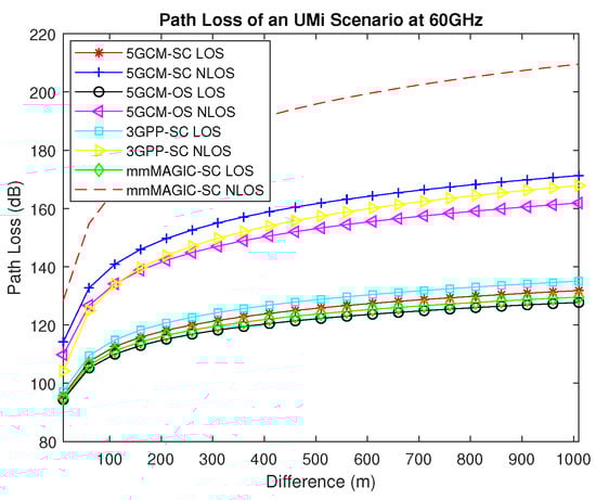 Figure 5, Figure 6, Figure 7 and Figure 8 measure and compare the PL of the urban macro environment at 28 GHz, 38 GHz, 60 GHz, and 75 GHz, respectively. Compared to other models, the line-of-sight 5GCM model produces less path loss, which can be observed in Figure 5, Figure 6, Figure 7 and Figure 8. The line-of-sight 3GPP path loss curve closely resembles the path loss in the LOS 5GCM model. In LOS propagation, the path loss of 5GCM is slightly higher than the path loss of 3GPP model if the distance is less than 300 m, it is equal at a distance of 300 m, and if the distance is greater than 300 m, the path loss of 3GPP is higher than the path loss of 5GCM. Therefore, 5GCM creates the lowest path loss after 300 m while 3GPP generates the lowest path loss up to that point. The highest path loss is produced by the 5GCM model in the NLOS scenario.