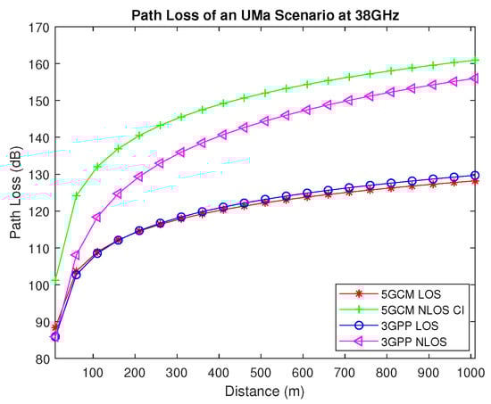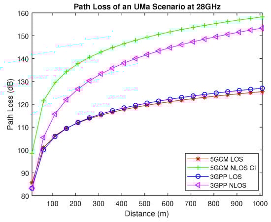 CI and ABG large-scale path-loss models are used to measure the PL in an urban macro environment [14,36,42]. In a UMa environment, the BS antenna height is 25 m, which is higher than the UMi case. This will help reduce the PL by avoiding obstructions below 25 m height from the ground surface [19].
