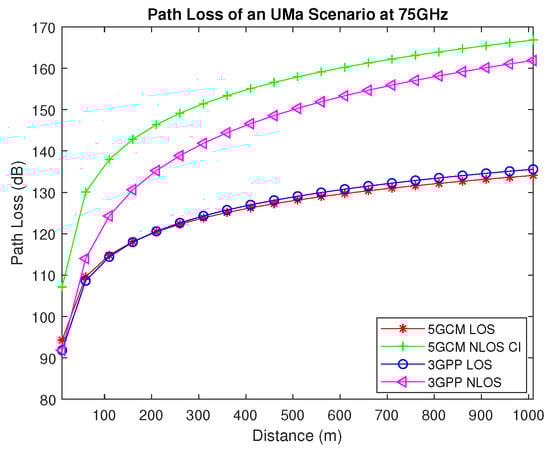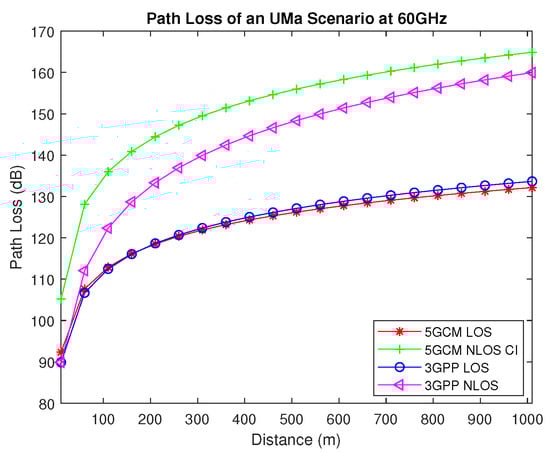 The LOS UMa PL is measured based on the break point distance and the ABG large-scale path-loss model. Similarly, UMa NLOS PL is measured using the ABG model for a standard deviation of 7.8 dB [17].