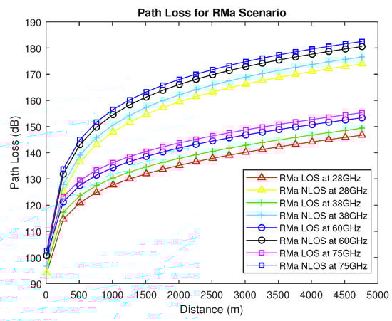 Figure 9 measure and compare the PL of the rural macro environment at 28 GHz, 38 GHz, 60 GHz, and 75 GHz. It can be seen from Figure 9 and Table 4 that path loss gradually rises with distance and frequency.