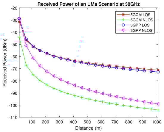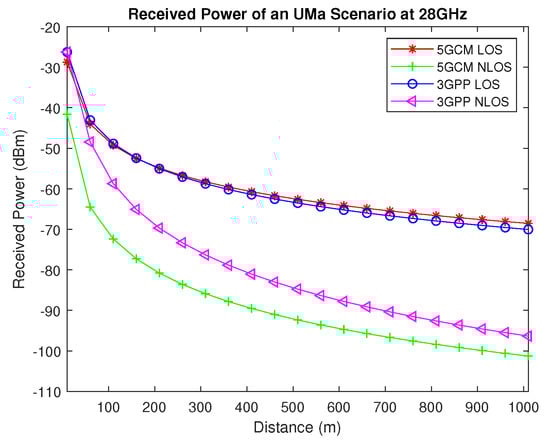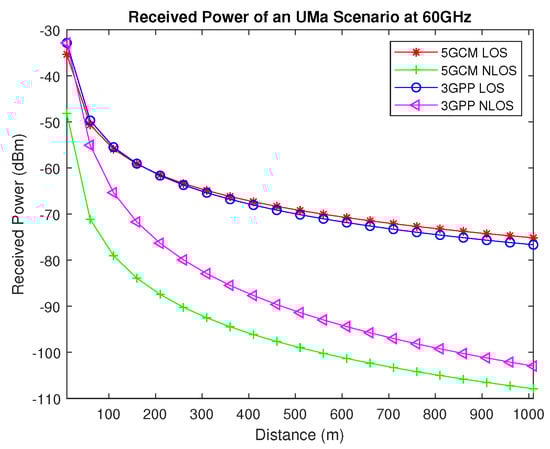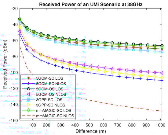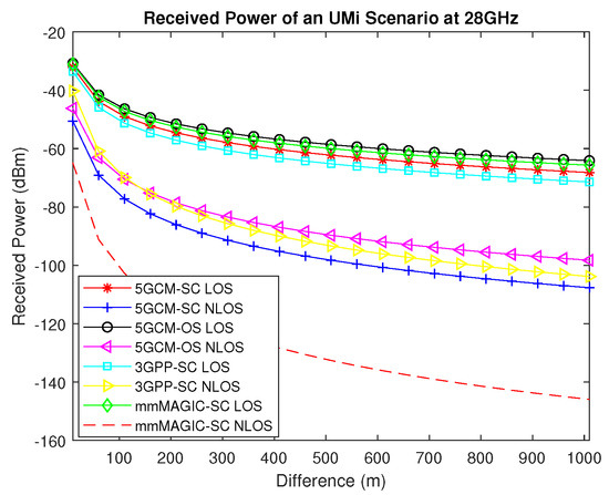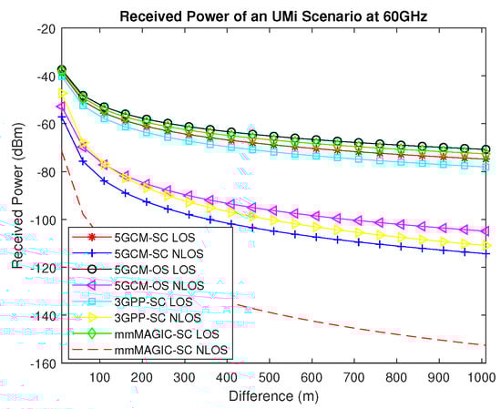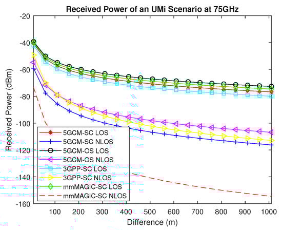 Received power in urban micro, urban macro, and rural macro environments are estimated using Equation (5). Figure 10, Figure 11, Figure 12 and Figure 13 measure and compare the received power of UMi scenario at 28 GHz, 38 GHz, 60 GHz, and 75 GHz, respectively. Compared to other models, the 5GCM-OS model produces the highest signal power in LOS scenario, which will be observed from Figure 10, Figure 11, Figure 12 and Figure 13. The line-of-sight mmMAGIC curve closely resembles the 5GCM-OS model. In NLOS propagation, the received power of 5GCM-OS is slightly lower than the received power of 3GPP-SC if the distance is less than 150 m, it is equal at a distance of 150 m, and if the distance is greater than 150 m, the received power of 3GPP-SC is lower than the received power of 5GCM-OS model. Therefore, 5GCM-OS creates the highest received power after 150 m while 3GPP-SC generates the highest received up to that point. The lowest received power is produced by the mmMAGIC-SC model in the NLOS scenario.