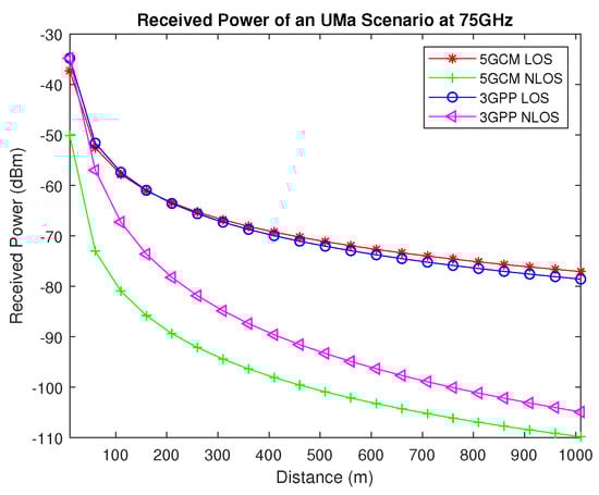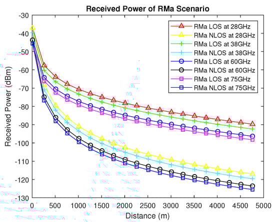 Received Power of UMi, UMa, and RMa environments at 28 GHz, 38 GHz, 60 GHz, and 75 GHz.