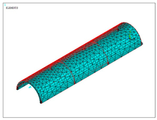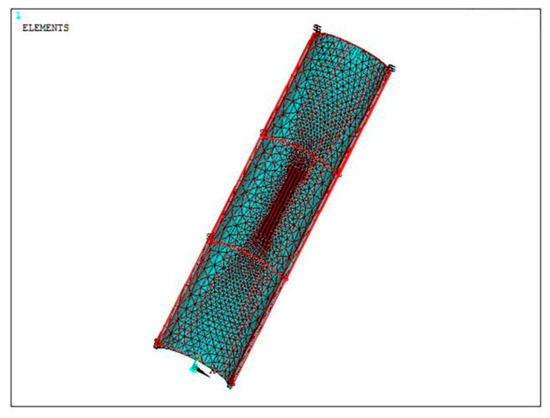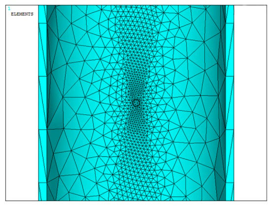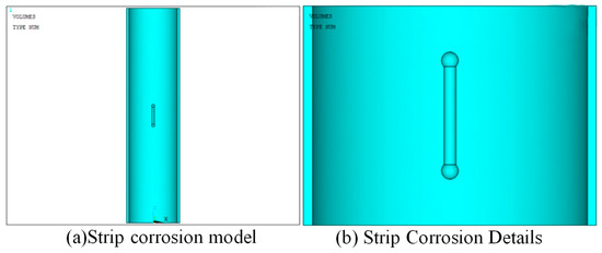 The model uses P110 casing, parameters of which are presented in Table 1. Take the casing finite element model with 1 m length: because the casing has a symmetrical cross-section, so the finite element model can be simplified as a symmetric model. The middle of strip corrosion is rectangular, ends are round, the overall appearance is strip and the finite element model is shown in Figure 9. Strip corrosion depth was selected with different values. The residual wall thickness is the total wall thickness minus the corrosion depth. Define the cell type and divide the grid, as shown in Figure 10. The uniform internal pressure is applied, and when the internal pressure is 50 MPa, the loading figure is shown in Figure 11.