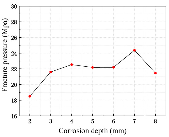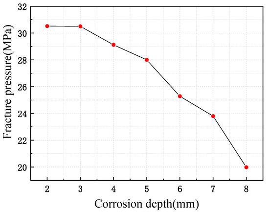 The relationship between fracture pressure and corrosion depth of casing with strip corrosion.