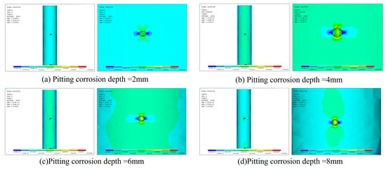 Figure 6 shows the equivalent stress and strain distribution of casing with different depths (2 mm, 4 mm, 6 mm and 8 mm) of pitting corrosion when casing is subjected to fracture pressure. As can be seen from the figure, the maximum stress and strain position are above and below the pitting, which is, diverging outward along the axial direction of the casing. While the left and right sides of the pitting cavity come out low stress and strain zones. This is mainly related to the force state of the casing. When the pitting depth is 2 mm and 8 mm, the shallow green stress zone of the casing is smaller than the area under the other two conditions, which is consistent with the results in Table 2.