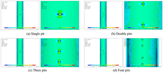 Figure 8 indicates the Mises stress and strain distribution of casing under fracture pressure with different number of pits. As can be seen from the figure, when casing with a number of corrosion pits under the inner pressure, each pit will appear a certain degree of stress concentration. However, a pit that shows the greatest Mises stress will be cracked firstly. When the internal pressure continues to increase, the remaining pits will be cracked successively. It is envisioned that if the number of pits is large enough, the stress concentration zone of adjacent pitting corrosion will intersect, and when such a situation occurs, the casing tends to be more prone to fracture. Therefore, in general, the greater the number of corrosion pits, the lower the compressive strength of the casing.