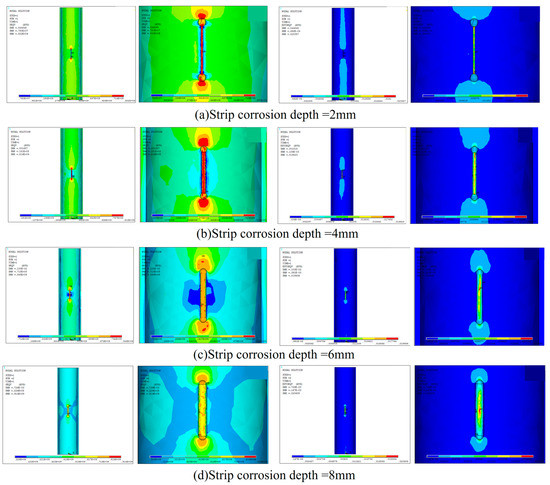 Figure 13 shows the relationship between the fracture pressure and the corrosion depth when the casing with strip corrosion is subjected to internal pressure. Figure 14 is Missile stress and strain distribution of casing with different strip corrosion depth under fracture pressure. It can be seen that with the development of corrosion and corrosion depth getting deeper, the remaining wall thickness becoming thinner, fracture pressure gets lower, and the fracture pressure reduce speed is faster. Initially, a reduction of 1 mm in wall thickness resulted in a fracture pressure decrease of approximately 0.02 MPa. However, as wall thickness continued to decrease, each 1 mm reduction resulted in a fracture pressure decrease of 4 MPa or more.