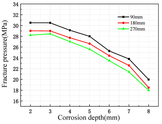 It can be seen in Figure 13 and Figure 15 that the effect of the length and depth of strip corrosion on the residual strength of the casing is not exactly the same. The failure pressure of the casing was decreasing when the length of the band corrosion was increased from 90 mm to 270 mm. However, the increase in corrosion length has little effect on the fracture pressure of the casing compared to the depth of the band corrosion. It can be seen that the effect of the depth of band corrosion on the fracture pressure is greater than the effect of the corrosion length.