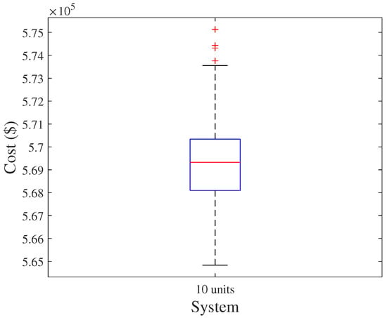 The ten-unit system from [] was used as an initial test for the proposed method. This system uses a planning horizon of 24 h. Table 2 provides the technical data on the system. The power demands are found in []. The spinning reserve is taken as 10% of the load, as in []. A total of 1000 HPLs were created, according to the procedure from []. Figure 1 shows the boxplot regarding the solutions for each one of the HPLs separately. The lowest cost found is equal to USD 564,795. The median of all solutions is equal to USD 569,327. The literature reports an optimal cost of USD 563,937. It can be observed that the process of generating HPLs was able to achieve solutions that are close to the optimal.