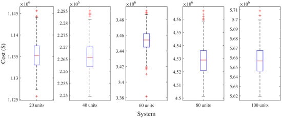 In order to validate the method brought in this paper, RM was put to the test in systems with 20, 40, 60, 80, and 100 units. These systems were obtained by duplicating the data from Table 2. Figure 2 shows the cost dispersion for these systems. Table 5 provides the median and minimum costs. Analogously to analysis of the the ten-unit system, these results were obtained prior to applying RM.