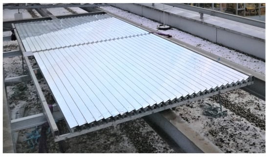 Figure 1 is the basis for the primary objective of developing a novel CPVT receiver using spectral splitting. It was manufactured by the company FRESNEX from Austria, the technology of which was acquired from the company ECOTHERM, also located in Austria. The mirror field has gross dimensions of 5.8 m × 2.3 m. It contains 28 plane mirror stripes with a width of 70 mm and a length of 5.72 m, mechanically connected and moved via a DC servo motor and a central control bar. Further mechanical details of the mirror field are described in [