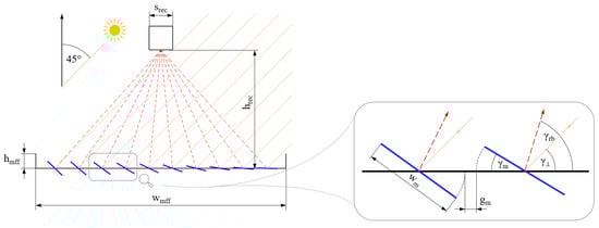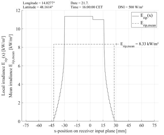 Another important performance parameter is the resulting local irradiance in the receiver input plane . As an assumption, the distribution of the local irradiance in the longitudinal direction of the receiver is considered as even, and therefore, the calculation of is restricted to the transversal dimension (x-direction) of the receiver cross section. For the calculation of , the full width of the receiver is sampled by an iterative loop within the model, applying a resolution of 0.1 mm. Each step of this loop checks if the corresponding x-position on the receiver is illuminated or if it is affected by any shading. In case of illumination, the separate values calculated for all mirrors are overlapped to a resulting irradiance value , given in kW/m2. Moreover, the total width of the focus image is obtained by summing up the illuminated x-positions.