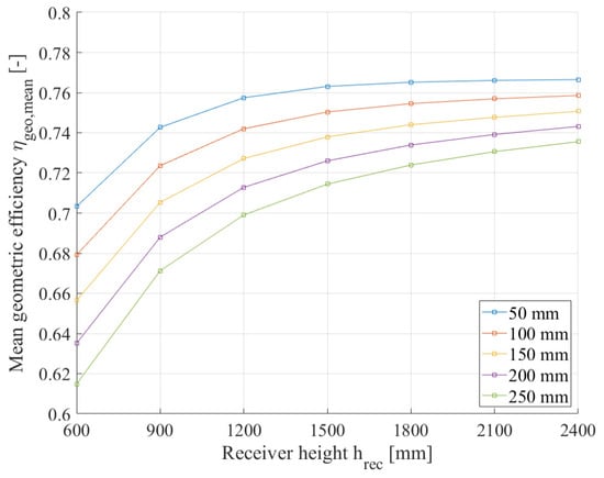 , and therefore, the influence of geometrical modifications can be quantified. For the present Fresnel mirror field with the given number of mirrors and defined mirror gaps, the effect of the receiver mounting height