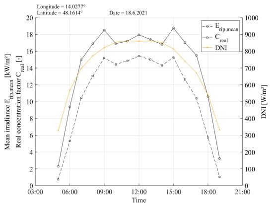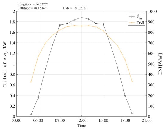 , the total radiant flux impinging the defined area of a future receiver can be calculated. As the planned prototype of a CPVT receiver for the Fresnel collector in Wels, Austria, will have a length of 1.5 m, the maximum radiant flux resulted in 1.88 kW at 12:00 on 18 June 2021 (see