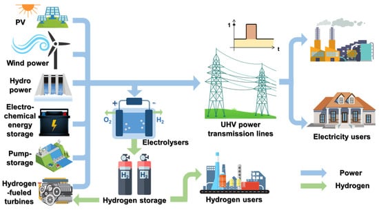 In this mode, electrolysers, hydrogen storage tanks, and hydrogen-fueled gas turbines are deployed at the source side, aiming at reducing VRE curtailment and supporting the stable power transmission over long distances using UHV lines, as shown in Figure 2. The volatile renewable power can be utilized by electrolysers due to its excellent dynamic responses. The produced hydrogen can either be used for local consumers, or for gas turbines to generate power again. It can serve as an important supplement to electro-chemical energy storage, pumped storage, and regulatory power sources, which can provide grid-balancing services and ensure a relatively stable power transmission by UHV lines.