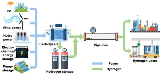 The high expectation of green hydrogen enhances the close interrelations between hydrogen and power systems. In China, renewable power will account for more than 90% of the total installed capacity of power sources [7], which could effectively reduce the adverse environmental effects of fossil fuels and address climate change [8,9], but also poses great challenges to the safe and stable operation of the power system. Hydrogen, as an energy carrier that can be easily and efficiently stored on a large scale, can serve as flexible energy storage for the power system. To be more specific, water electrolysis can function as a flexible load, while along with fuel cells and hydrogen-fueled gas turbines, it can provide long-term flexibility [10,11,12]. However, the main obstacle that limits the widespread use is the relatively high cost [13,14].