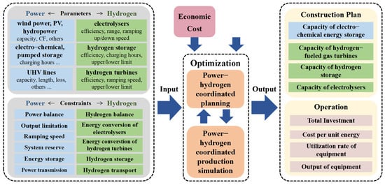 In order to quantitatively compare the above-mentioned modes, a power–hydrogen coordinated planning optimization model is proposed. The basic principle of this model is shown in Figure 4. This model could optimize the configuration of both the power system and the hydrogen system, simultaneously. In the power system, various generation sources (wind power, PV, and hydropower), transmission lines, and energy storage units (electro-chemical energy storage cells and pumped storage) are taken into consideration. Similarly, in the hydrogen system, electrolysers, hydrogen/natural gas pipelines, hydrogen-fueled turbines, and hydrogen storage tanks are considered.