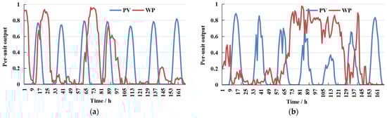 The data of the per-unit output of PV and wind power (WP) shown in Figure 5 are real data from Southeastern Xinjiang. As shown in Section 4.1, the installation capacity of PV (240 million kilowatts) was much larger than that of WP (4 million kilowatts), which would cause more significant influences. Therefore, the two sets of per-unit output of PV were chosen first, with one representing weeks with low volatility and the other representing weeks with larger volatility. Then, the corresponding per-unit outputs of wind power on the same days were chosen.