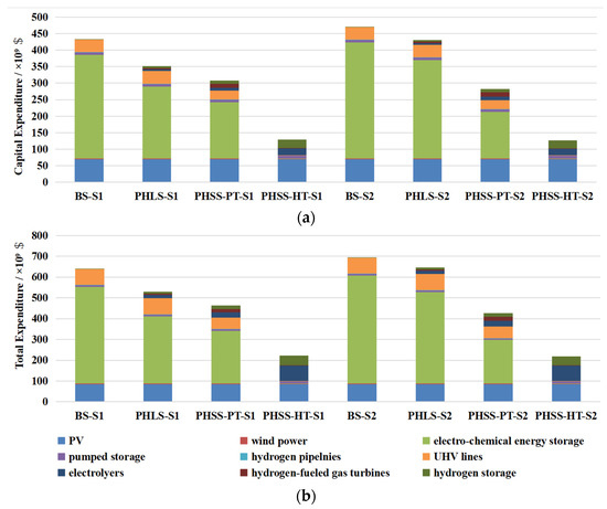 In S1, for electro-chemical energy storage units, its capacity factor was the largest in PHSS-PT, which was 8.71% larger than PHLS and 11.53% larger than the BS. For electrolysers, hydrogen storage tanks, and hydrogen-fueled gas turbines, the capacity factor was the largest in PHLS, followed by PHSS-HT and PHSS-PT.
