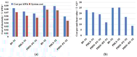 The cost per unit energy for different schemes: (a) total cost and system cost for electricity and (b) cost per caloric value.