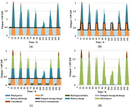The operation characteristics of the main equipment in the four schemes in S2 are shown in Figure 8 and Figure 9. Figure 8 demonstrates electric power, which includes the output of power resources, the net output of energy storage units, the power consumed by electrolysers, and the power transmitted by UHV lines. Figure 9 shows hydrogen production and consumption.