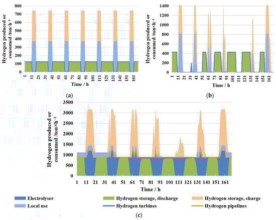 The hydrogen production and consumption of key equipment in a typical week in the three schemes, S2: (a) PHLS, (b) PHSS−PT, and (c) PHSS−HT.