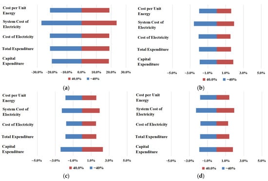 From Figure 10a, the cost of electro-chemical energy storage cells had a large influence on the optimization results. When it decreased by 40%, the capital and total expenditure decreased by 20.19% and 30.84%, respectively. The levelized cost of electricity and the system cost decreased by 21.48% and 27.18%, respectively. The cost per unit energy showed a 21.39% decrease. When the cost of electro-chemical energy storage cells increased by 40%, the increasing range of optimization results was comparatively smaller, mostly between 18% and 24%. The costs of electrolysers, hydrogen-fueled turbines, and hydrogen storage units had a relatively smaller impact on the optimization results, as shown in Figure 10b–d. The variation range of capital, total expenditure, levelized, and system costs of electricity, and the cost per unit energy, were all less than 5%.