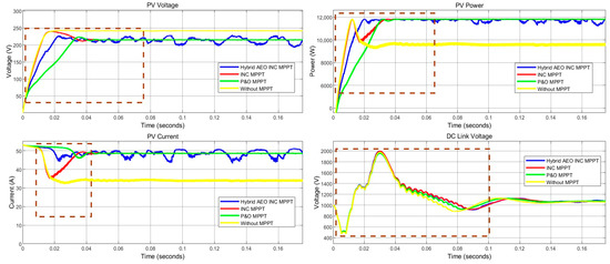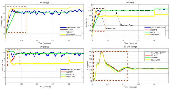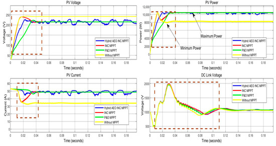 Measurements of PV voltage, PV current, PV power, and DC link voltage are taken while keeping the temperature and irradiance of the simulated PV system constant at 25 °C and 1000 , respectively. The graphical representation of all the measured parameters with reference to time is given in Figure 8 below. Figure 8 also illustrates the performance of the proposed MPPT, INC MPPT, P&O MPPT, and the system without MPPT.