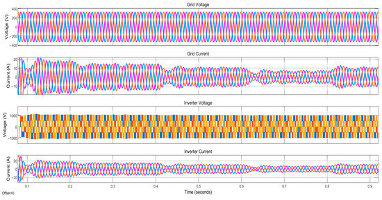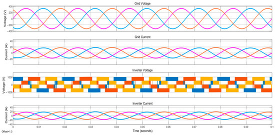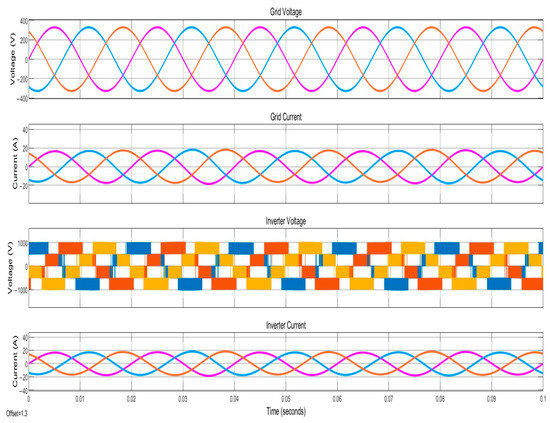 Figure 20 depicts the output of the voltage and current of the grid and inverter at varying temperature conditions. The voltage at the grid is maintained at 400 V. However, inverter voltage has three levels. The grid and inverter currents change with changing temperatures.