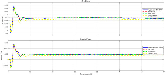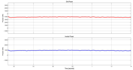 The results of the grid and inverter power for the constant temperature and irradiation conditions are shown in Figure 10. Grid and inverter power have been maintained at 9.6 kW and 9.7 kW, respectively.