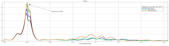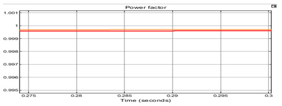 The results for the power factor of the grid and the total harmonic distortion (THD) of the grid current at 1000 and 25 °C are shown in Figure 11 and Figure 12, respectively. The plots reveal that the power factor is kept constant at 0.999, and the grid current has a total harmonic distortion that is less than 5% and complies with IEEE standards.`