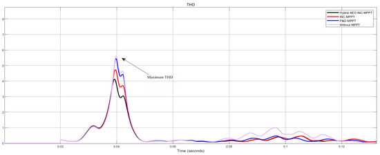 The comparison of various performance parameters (rise time, settling time, peak power output, and THD) of the proposed MPPT, INC MPPT, P&O MPPT, and PV system without MPPT is tabulated in Table 3 below for the varying irradiance from 1000to 400and constant temperature at 25 °C.