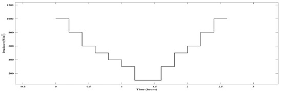 The irradiance of the PV array is initially decreased from 1000 W/ to 400 W/from 400 W/ with the same step size. The varying irradiance input, to which the PV system has been subjected, is represented in Figure 13. However, the temperature is maintained at 25 °C. Figure 14 depicts the simulation results of the PV system′s output voltage, current and the power and DC-link voltage output of the inverter at varying irradiance conditions. For the irradiance level of 1000, the PV voltage is maintained at 230 V, the PV current is maintained at 45.47 A, and the PV power is maintained at 10.43 kW. Figure 14 also illustrates the performance of the proposed MPPT, INCMPPT, P&O MPPT, and the system without MPPT.