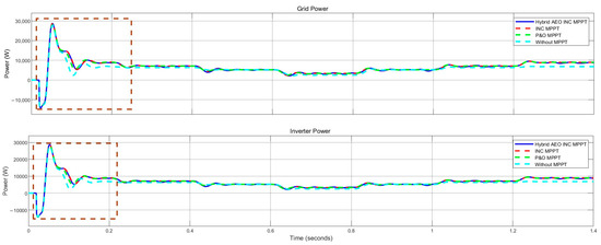 Grid power and inverter power at varying irradiance conditions have been represented in Figure 16. The plots reveal that the grid and inverter power change with the PV scheme′s varying irradiance conditions.