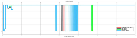 Plot of power factor of the grid current vs. time for changing irradiance conditions.
